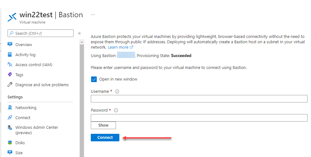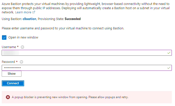 One thing to note, the Bastion connection will pop up a new browser window. Microsoft will let you know if your pop-up blocker is getting in the way of launching the connection window.