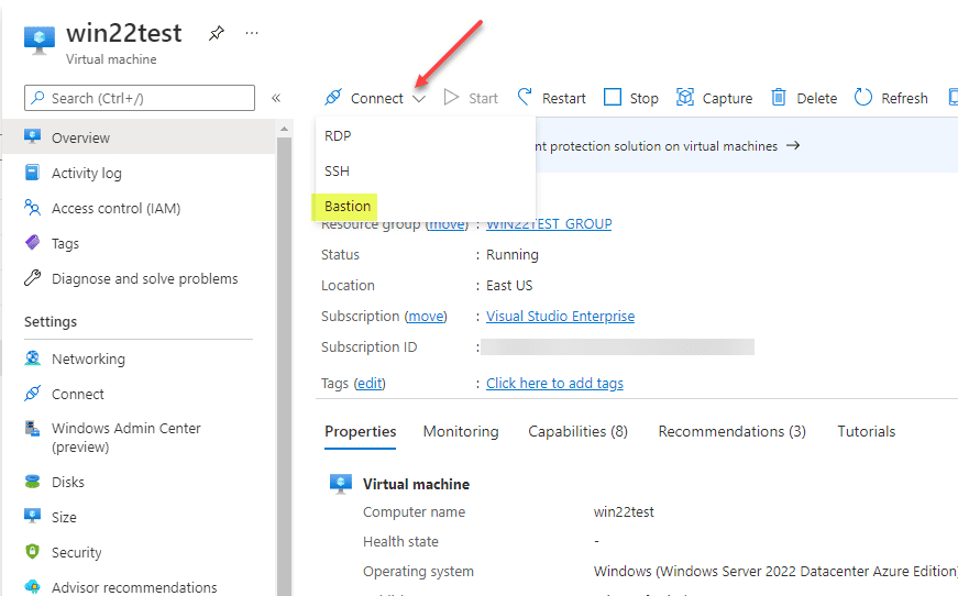 Now, when you view an Azure VM and click the Connect option, you will see the Bastion option.