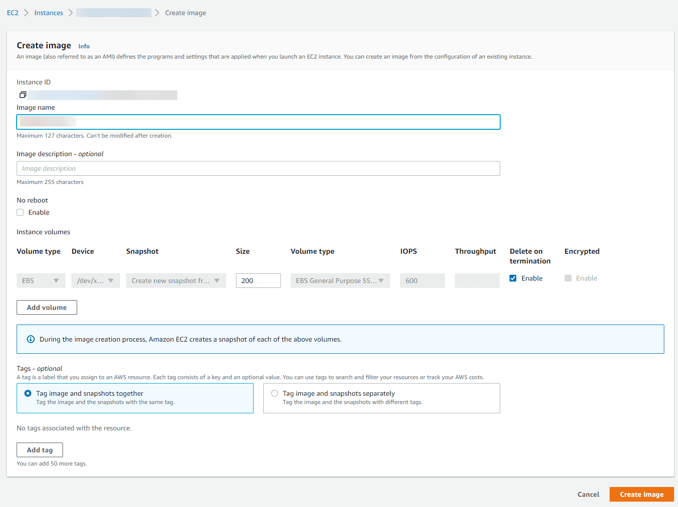 On the Create image page, you name the new AMI image and assign a description, tags, etc. Once you have assigned everything for the image, click the Create image button.