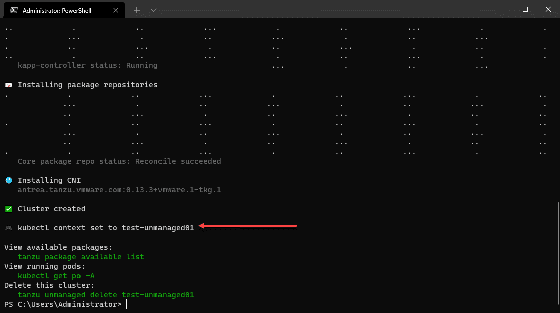 Part of the unmanaged cluster creation process is the kubectl context is automatically configured to the new unmanaged TCE 0.10 cluster.