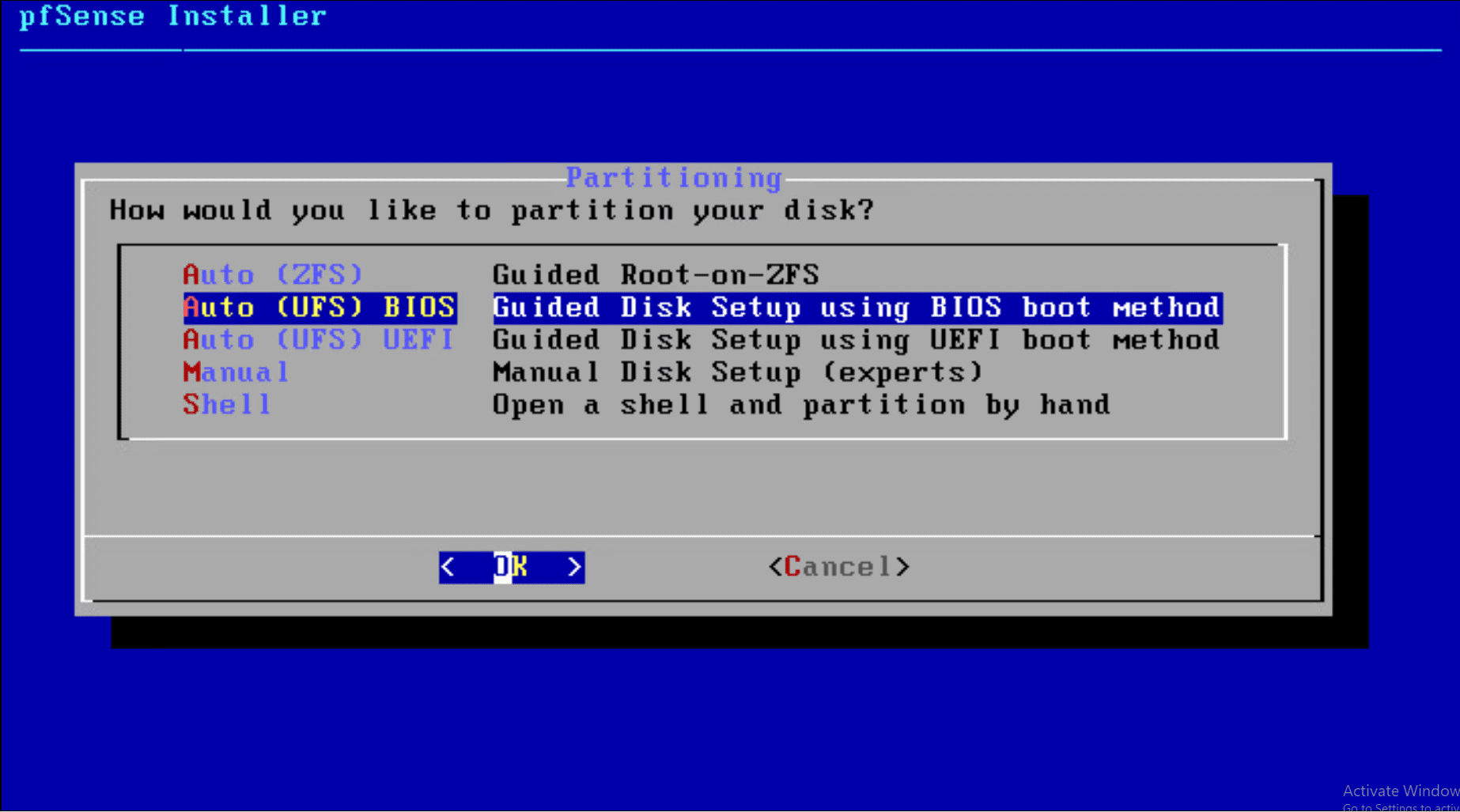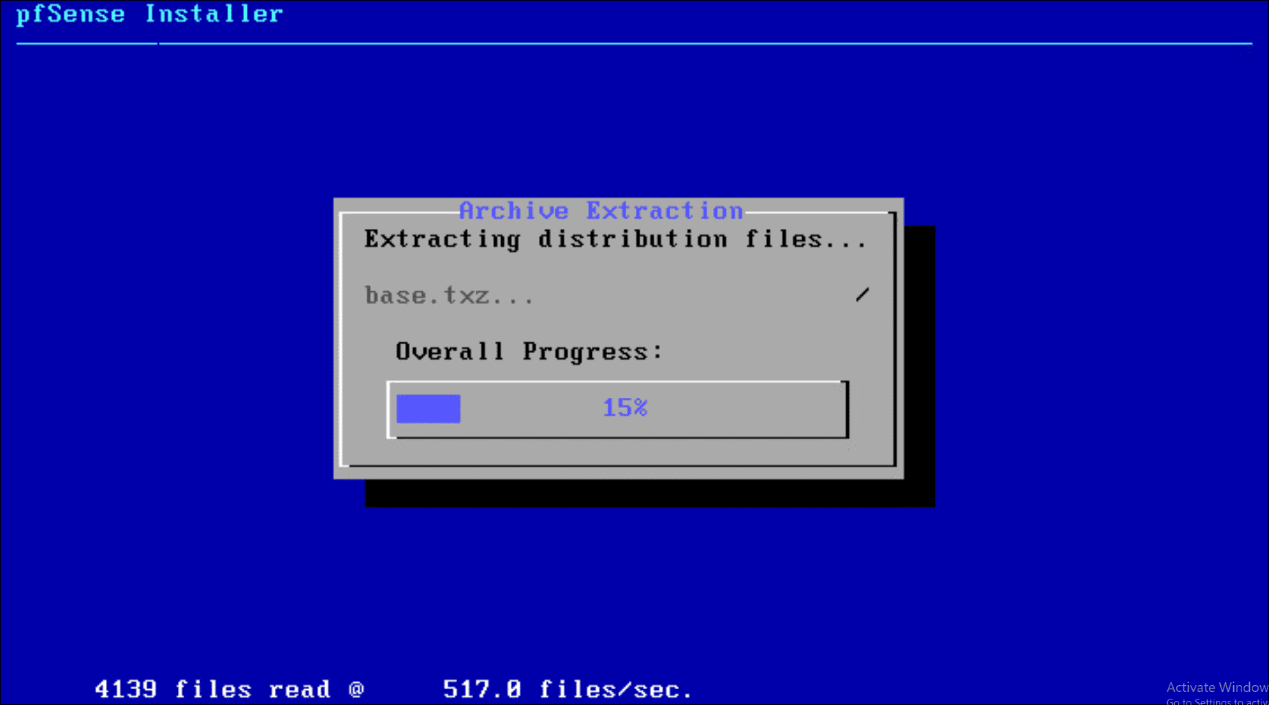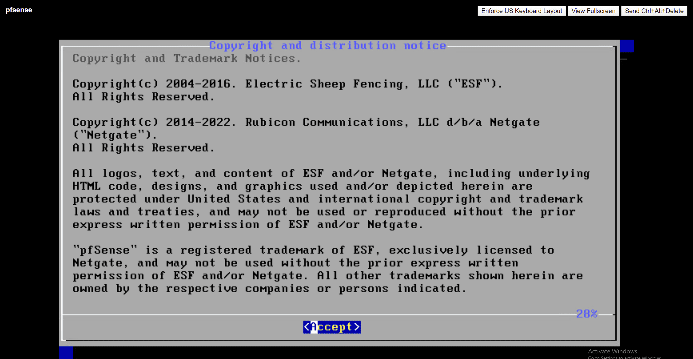 Boot the virtual machine and you should see the pfSense installation begin. Accept the EULA on the first text-based screen.