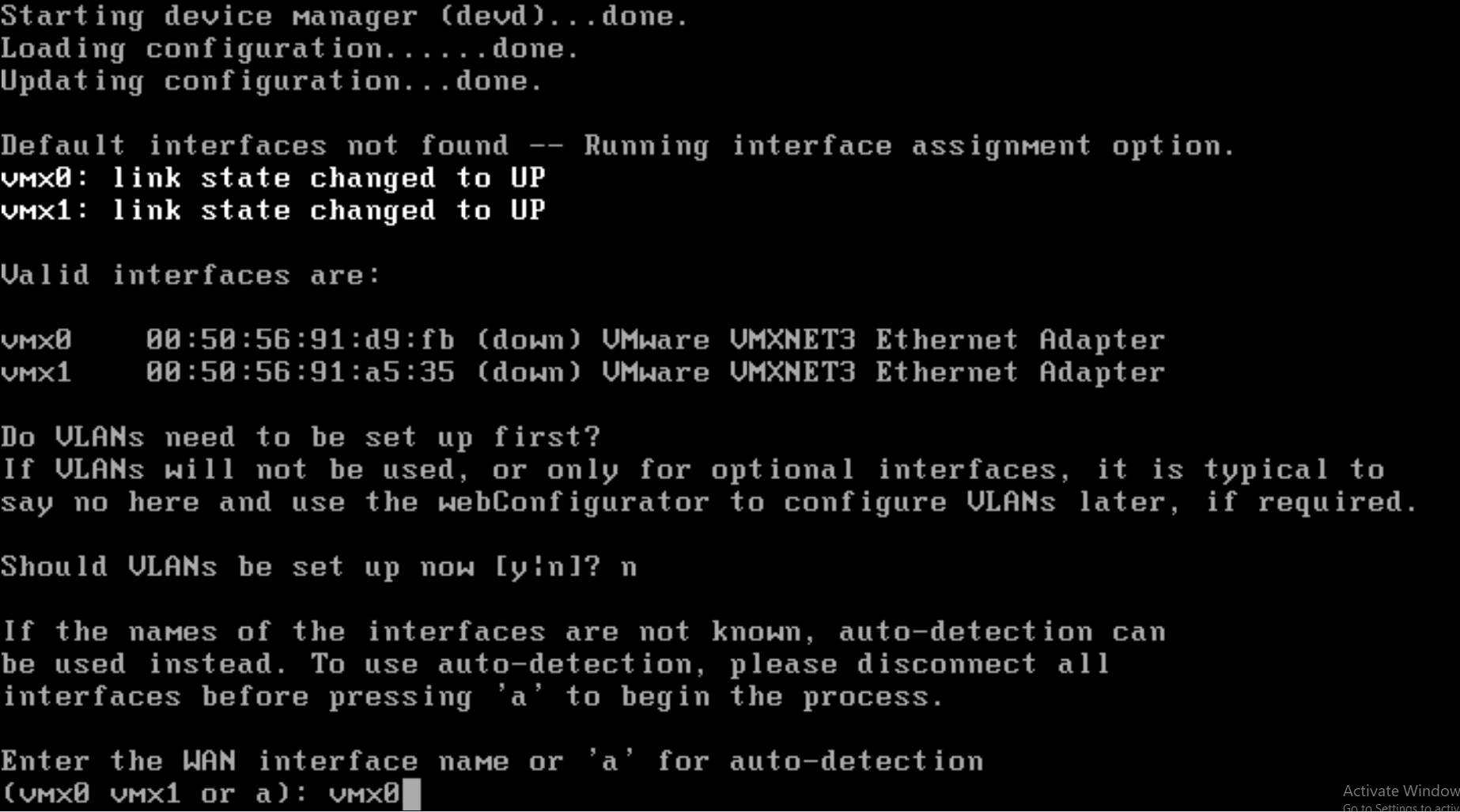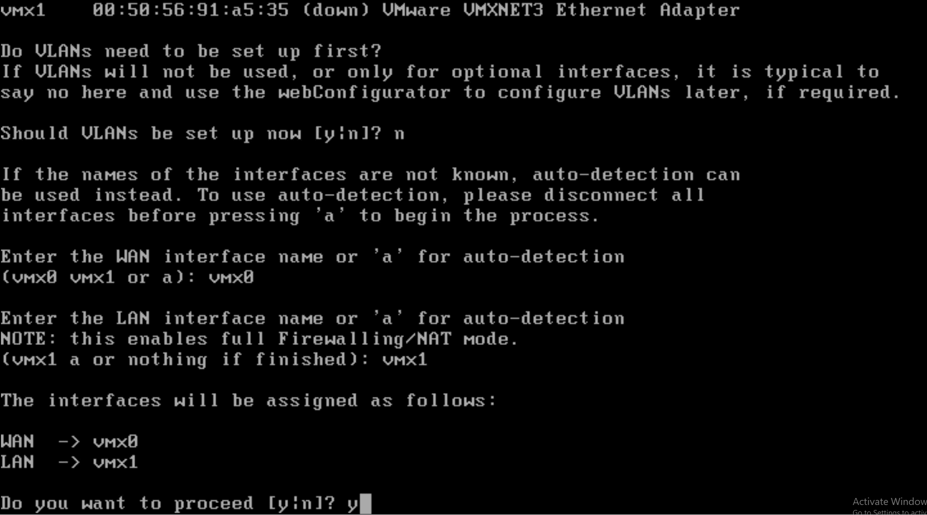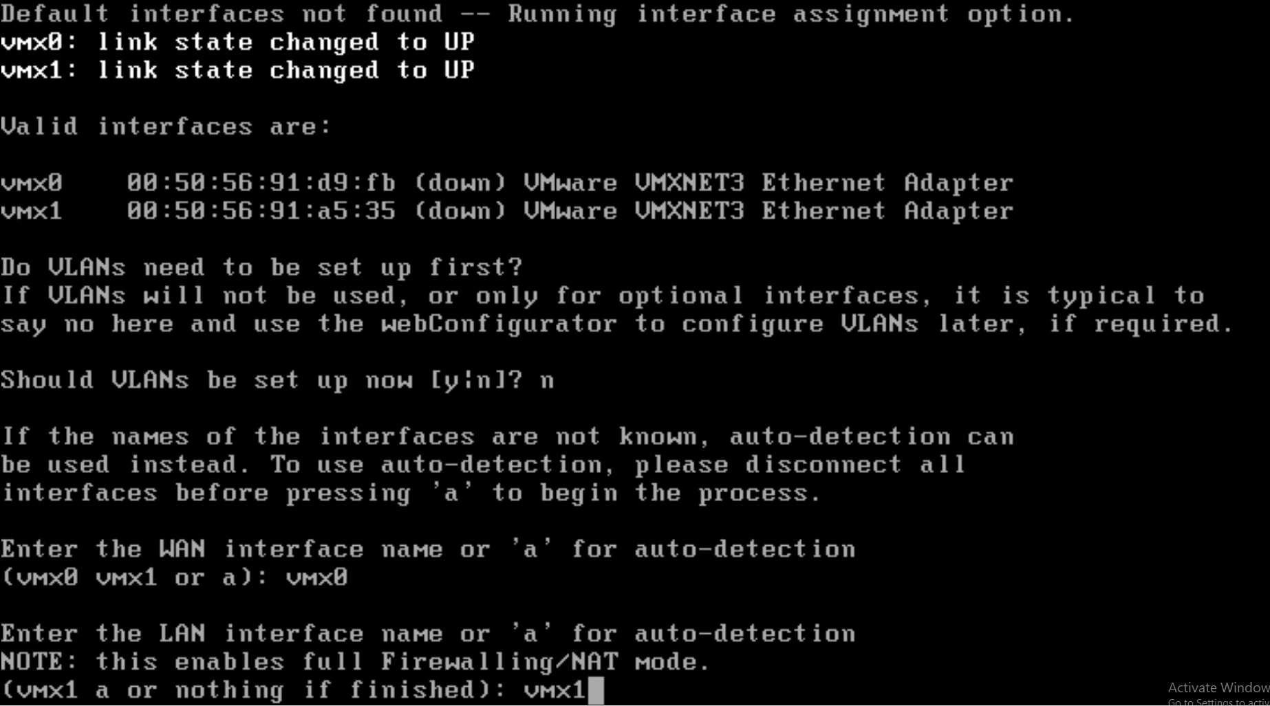 The next section of the text-based configuration is extremely important. You are prompted to choose the WAN and LAN interfaces. Here you need to select the correct VMware vSphere vmnics assigned to the pfSense virtual machine. Here it would be easy to cross up the vmnics with the assignment of WAN and LAN.