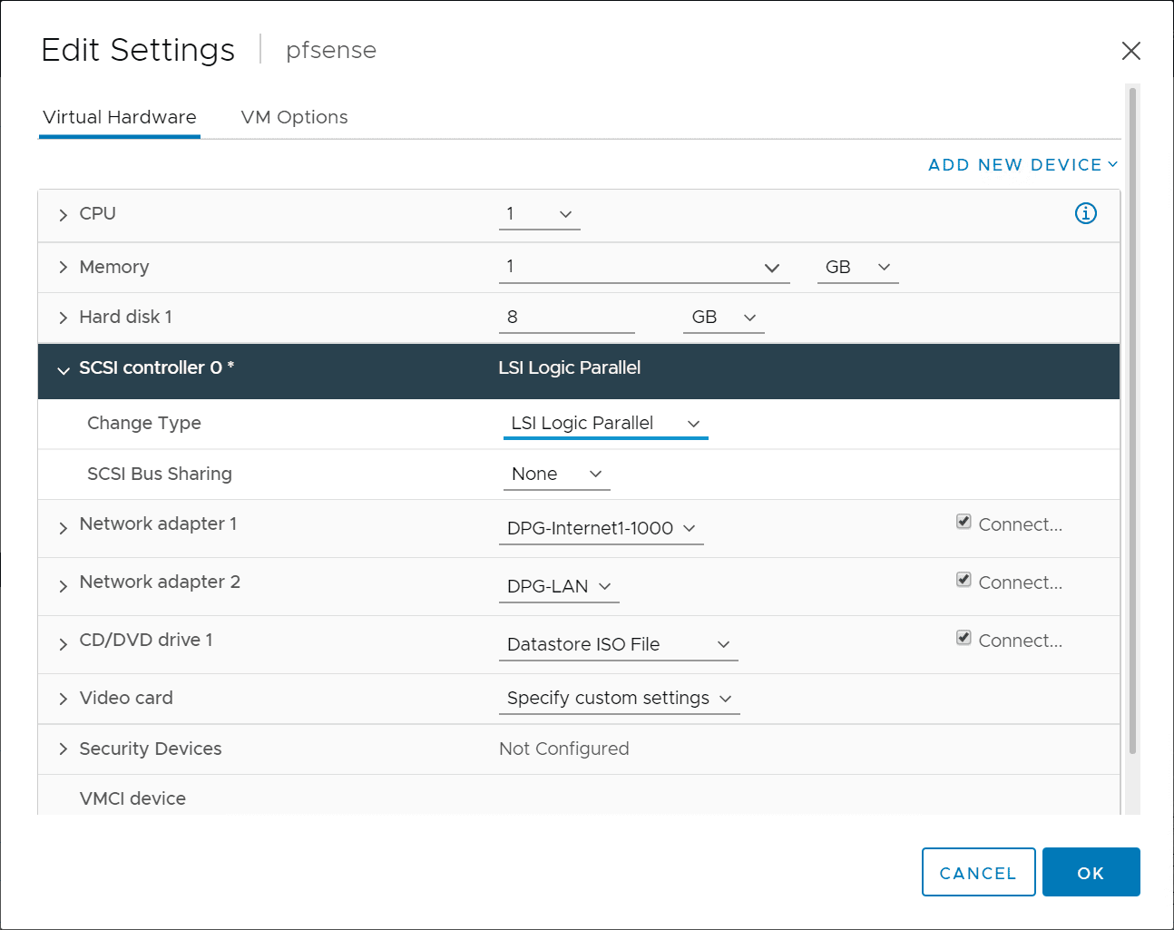There are several changes we need to make on the customize virtual hardware screen. This includes changing the storage controller to LSI Logic Parallel or LSI Logic SAS controller. Make sure you have at least two network adapters added to the VM. One will be the WAN connection and the other the LAN connection. Also, select the pfSense ISO and configure this for the CD/DVD drive. Make sure it is set to connected and connect at power on.