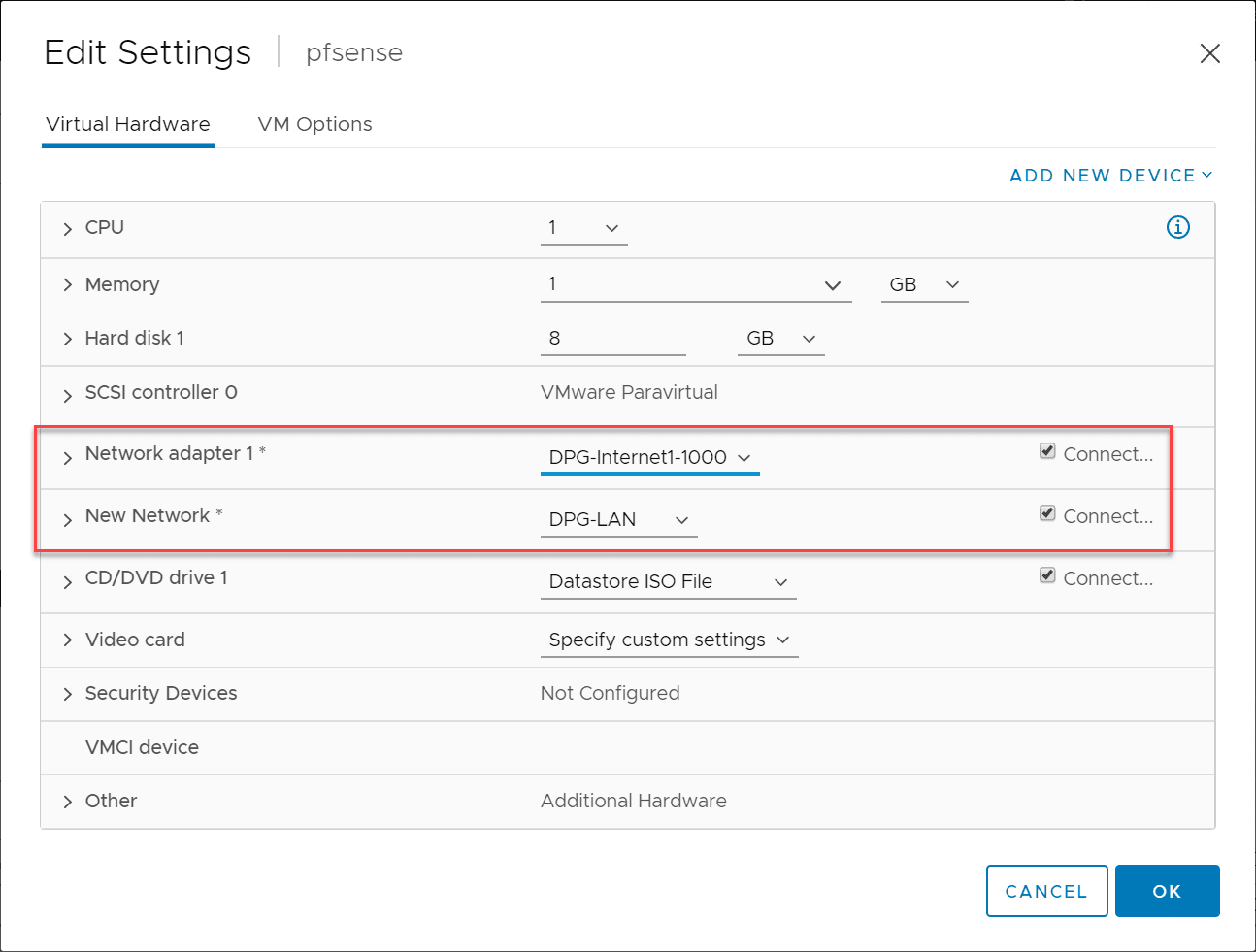 Below, as you can see, I have set one of the connections to a port group connected to the Internet and the other to the LAN.