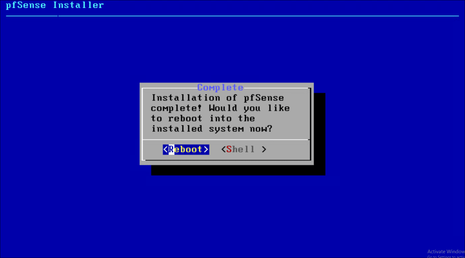 The installation of pfSense finishes and you are prompted if you want to make any further configuration changes using the shell.