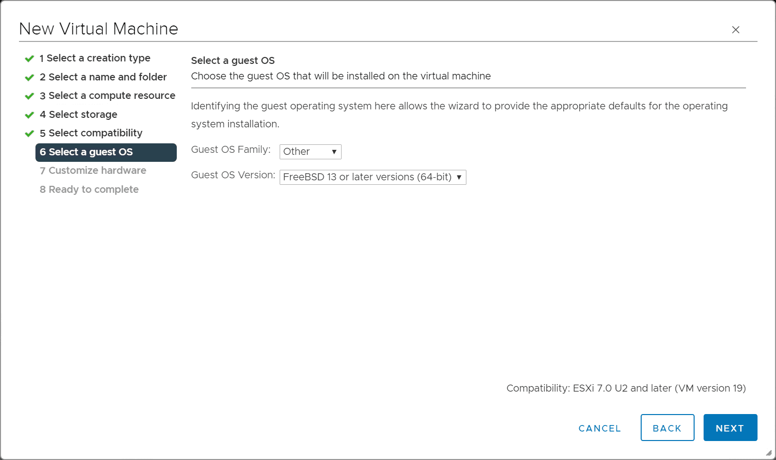 On the Select a guest OS screen, change the Guest OS Family selection to Other. Then on the Guest OS Version, select FreeBSD 13 or later versions (64-bit).