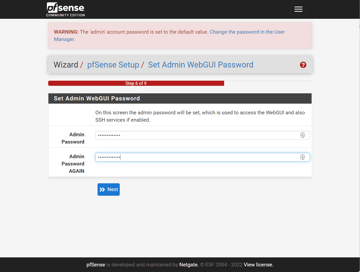Set the WebGUI password. Be sure to change your WebGUI password from the default “pfsense” password set during the installation.