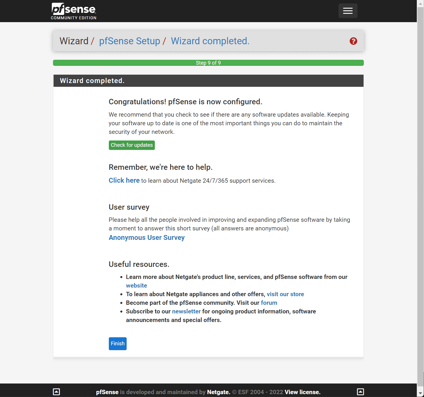 Finally, after reloading click to Finish the Webconfigurator configuration.