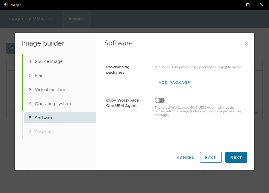 On the Step 5 Software screen, you can add packages and copy Workspace One UEM Agent.