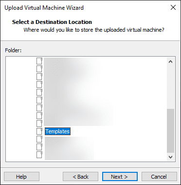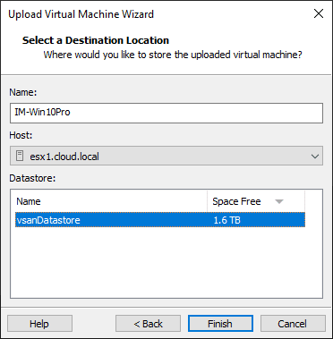 Select the destination in vSphere inventory for uploading the virtual machine to vSphere.