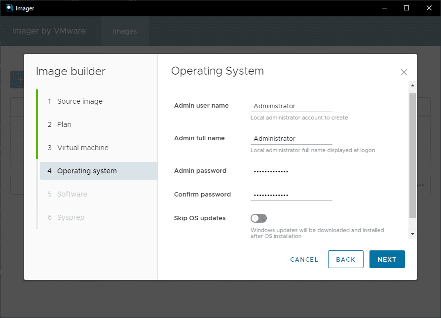 The Operating System configuration screen contains configuration for the operating system, including the Admin user name and password, as well as Skip OS updates toggle. This toggle allows skipping the downloading and installation of Windows updates.