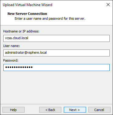 Enter the connection information for your vCenter Server. Note this can also be an ESXi server.