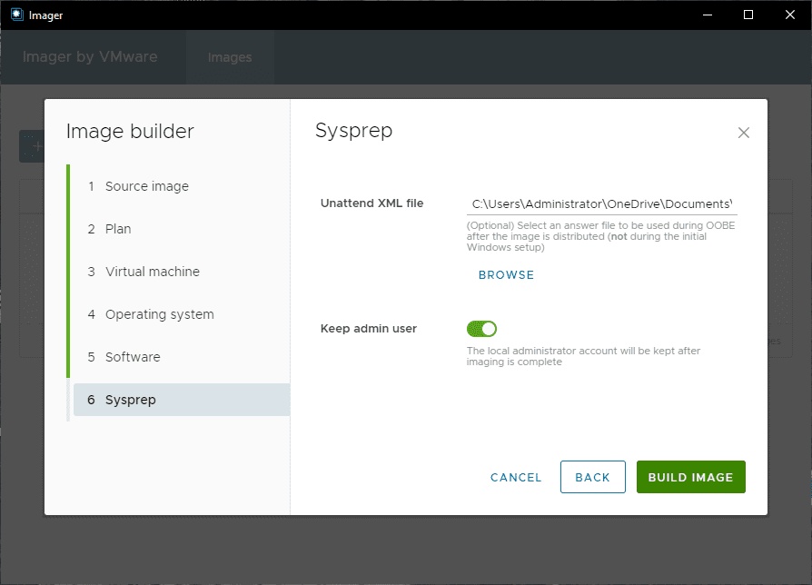 Finally, on the Sysprep screen, you can feed the installation an unattend XML file. You can also toggle the Keep admin user. Once you have these configurations set, click the Build Image button. It will begin the image build process.