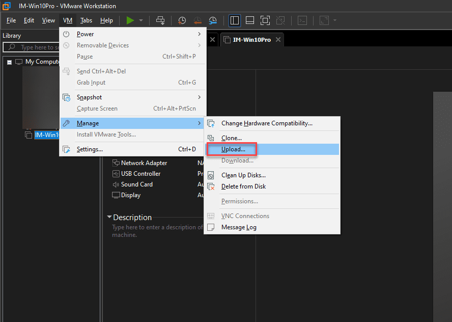 Now, you can easily upload the virtual machine to vSphere. Click VM > Manage > Upload to start the upload process to vSphere.