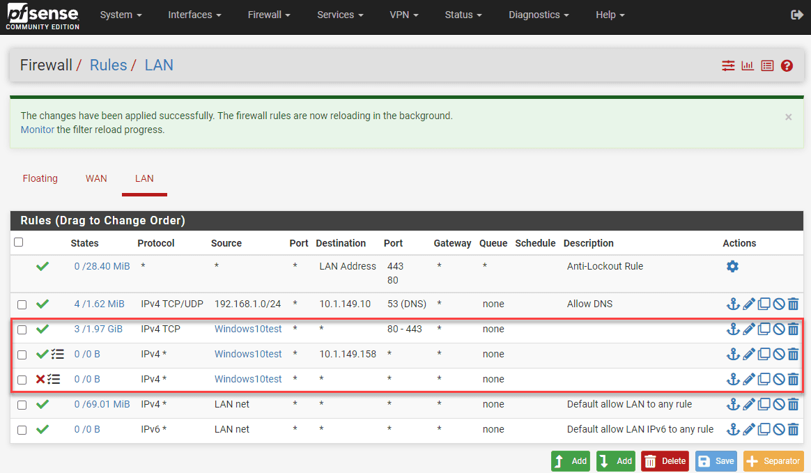 Following this principle, as you can see I have a client that I have an alias setup for in pfSense called Windows10test. In the top firewall rule outlined, note the following: