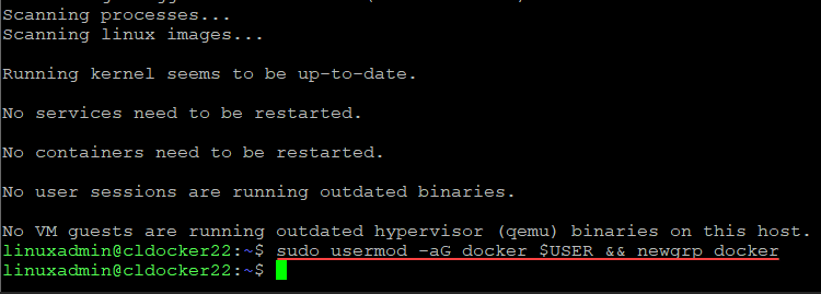 Once Docker is installed, we need to add our non-root user to the Docker user’s group. To do that, we run the following command: