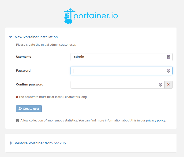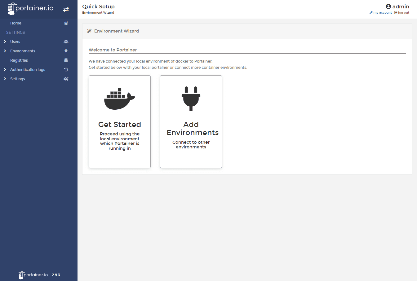 Once the container image is pulled down, you should be able to navigate to your IP or hostname of your Docker host, port 9443.