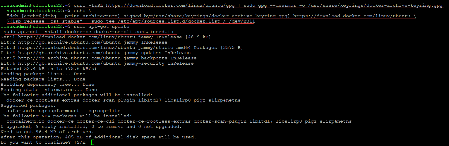 Next, we install Docker. Here, I am not doing anything special for Ubuntu 22.04, but rather, I am just following the documentation found here: