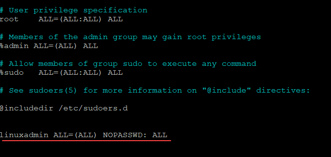 Once you enter the sudo visudo command, you will add the following line at the very bottom of your file. Save and close.