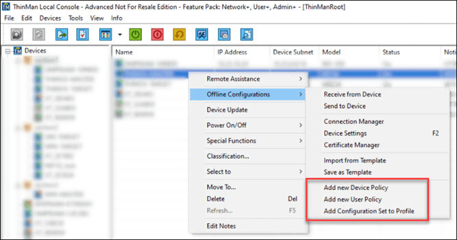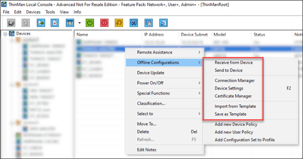 As you can see below, you can perform various operations with the Offline Configurations options in ThinMan Server for remote clients. These include: