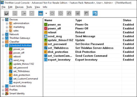 Another task ThinMan Server can perform is infrastructure optimization. For example, if you want to control power for all your managed endpoints, you can create a scheduled activity to turn on devices at a particular time, conserving power. ThinMan can also exploit and control the Wake On Lan device feature to offer a complete Power Management orchestration.