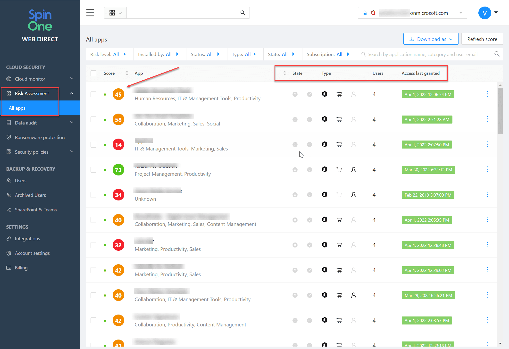 Scoring cloud SaaS apps is a huge undertaking performed manually and may require thousands of man-hours. However, SpinOne’s new risk assessment takes the heavy lifting out of the process. SpinOne’s new risk assessment for Office 365 automatically scores cloud SaaS apps based on several risk factors and continuously scores cloud SaaS apps. There is the chance that is trusted with one version may begin to display undesirable traits with future releases. SpinOne continues to score apps and adjusts the risk score accordingly.