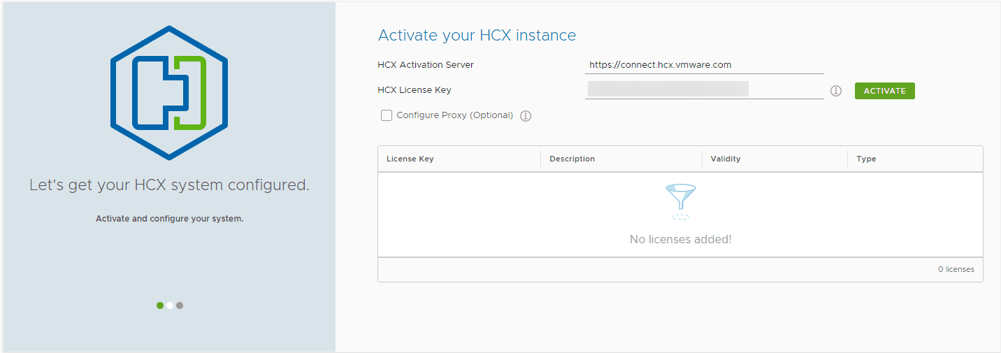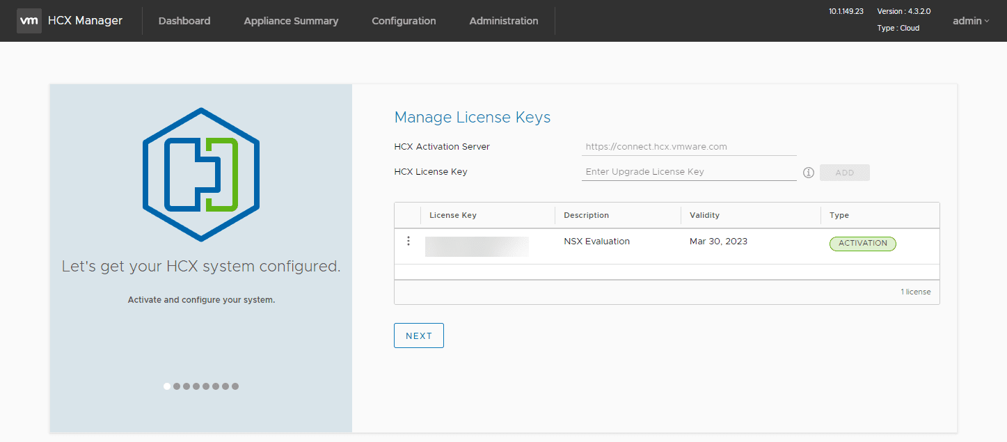Next, enter a license key. One of the misnomers for me when I went through this was that I didn’t need to enter a VMware HCX key but rather a VMware NSX-T key.