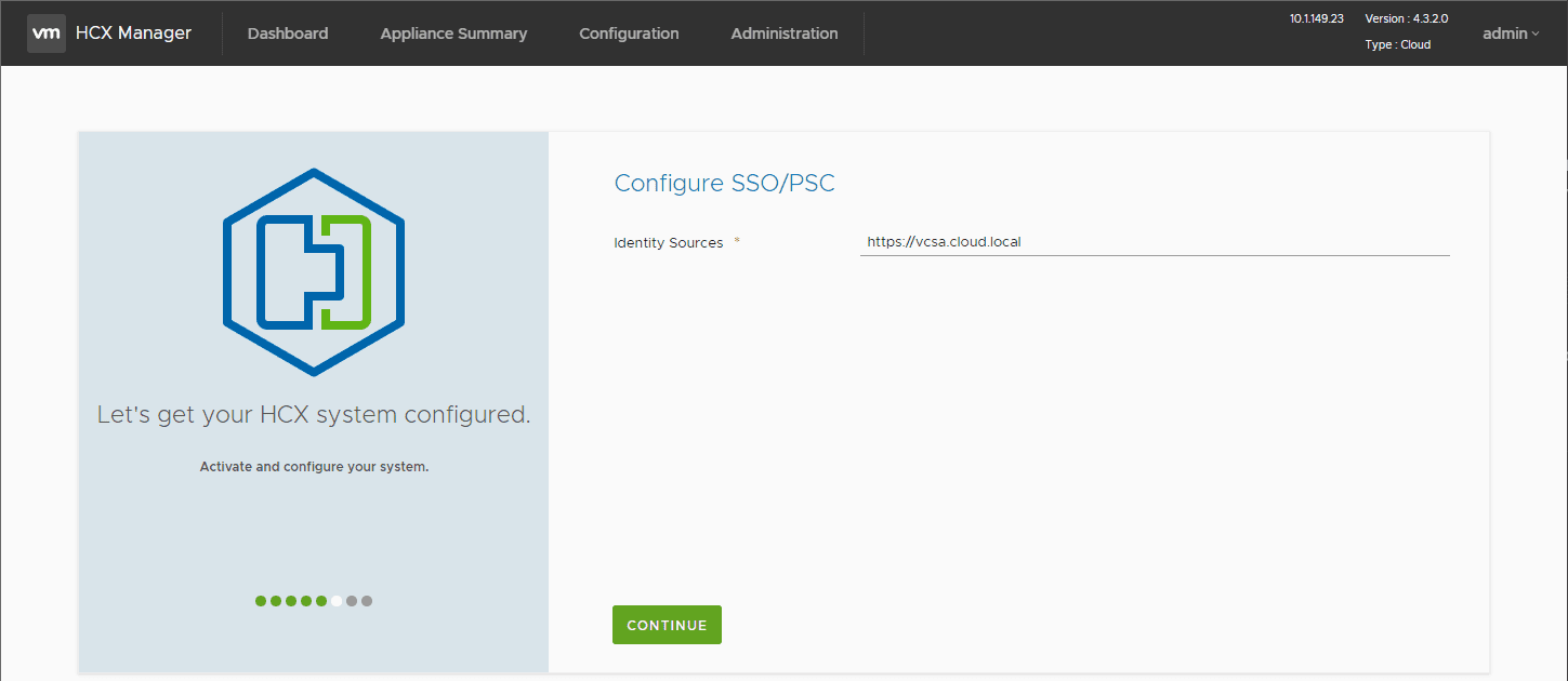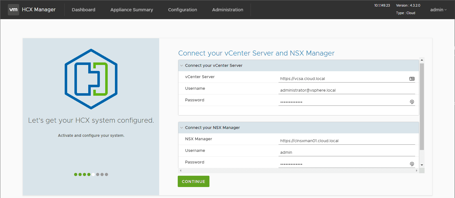 Connect VMware HCX to your vCenter Server and NSX Manager appliances. Here you enter the URL for vCenter Server and the NSX Manager along with credentials to connect.