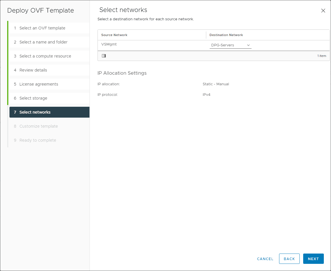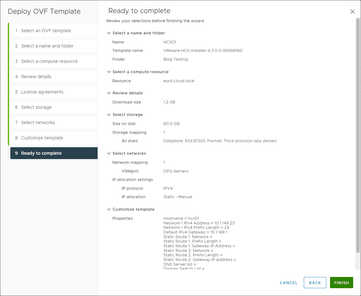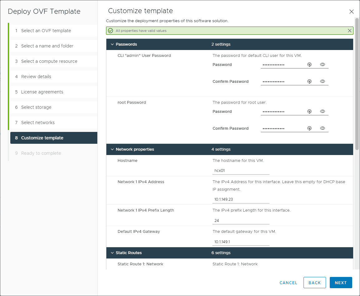 On step 8. Customize template, this is where you want to pay attention and make sure you populate everything correctly. Here you need to ensure you populate the credentials you want to configure, network address, DNS, DNS lookups, static routes, enable SSH (if desired), NTP, and other options. Be sure to look this screen over a few times before moving on.
