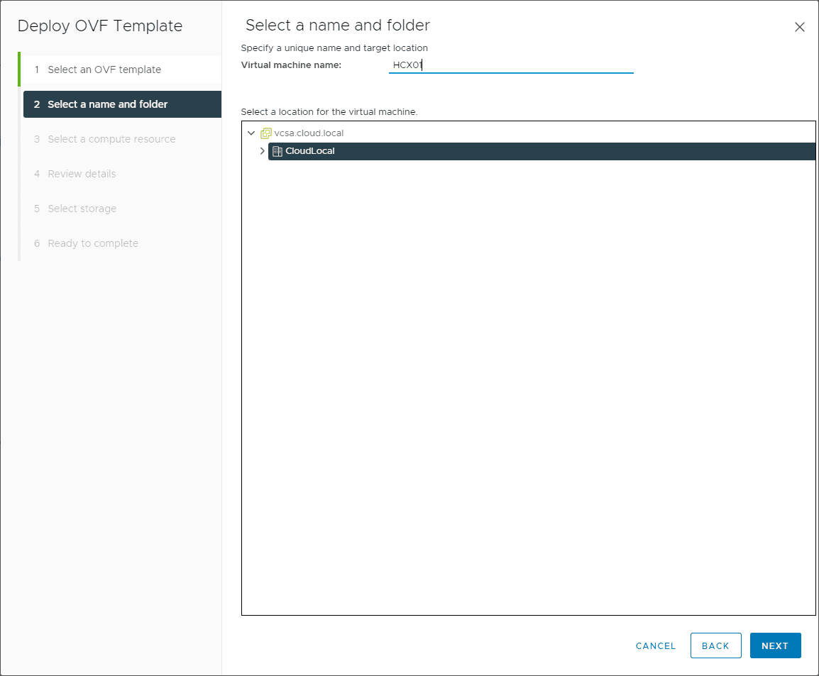 Name the virtual machine. This is the name of the VMware HCX appliance in the vSphere inventory.