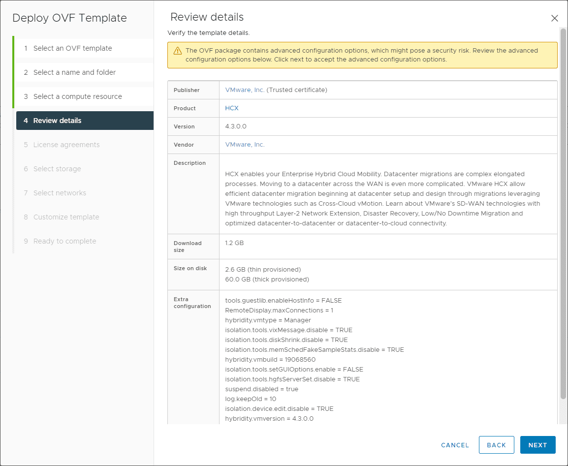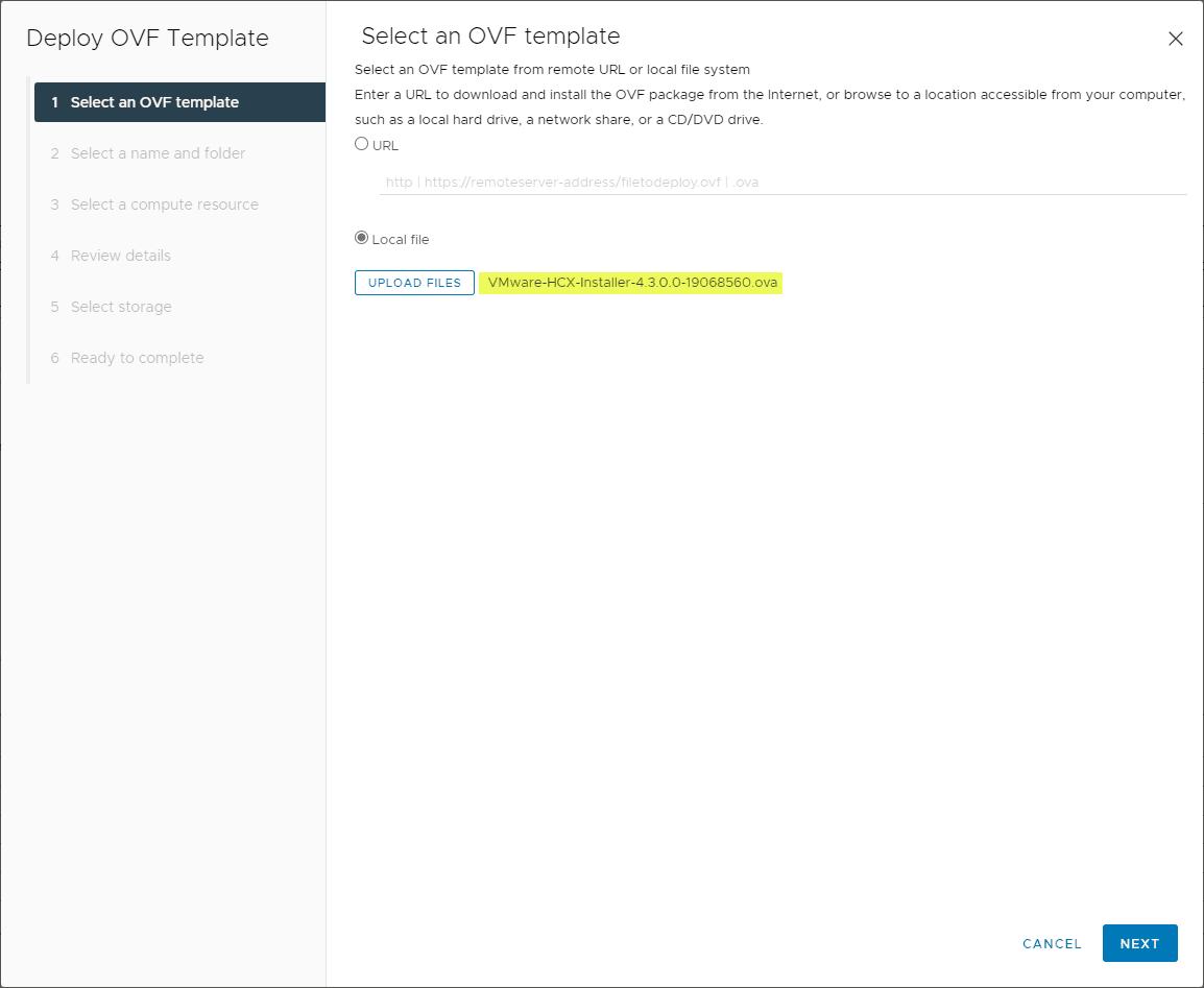 The OVA deployment process for the VMware HCX appliance is straightforward, like most other OVA deployments. First, upload the VMware HCX OVA file.