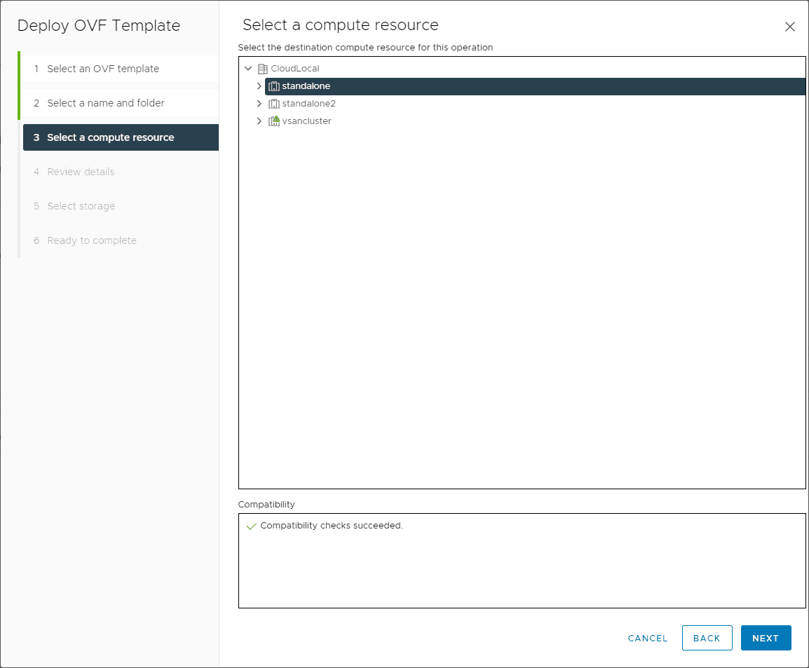 Next, choose the compute resource you want to use to house the VMware HCX appliance.