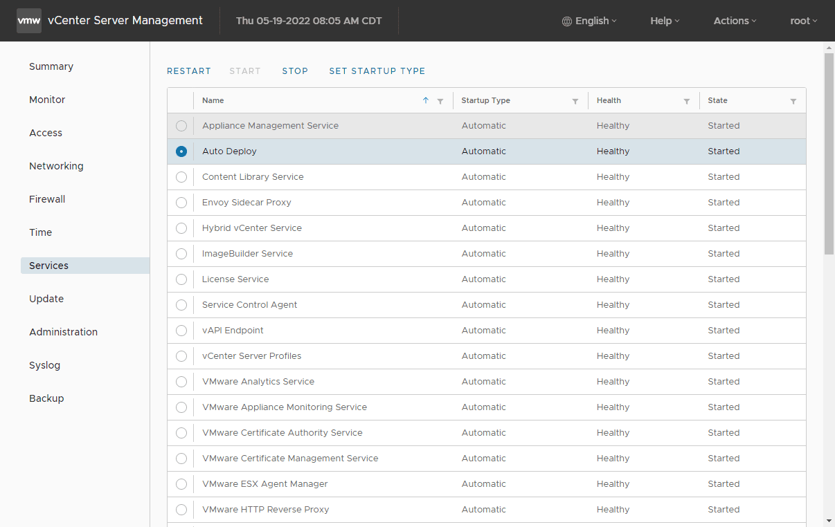The same goes for the Auto Deploy service. Below, it is set to Started and Automatic.