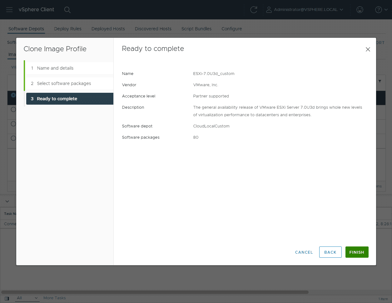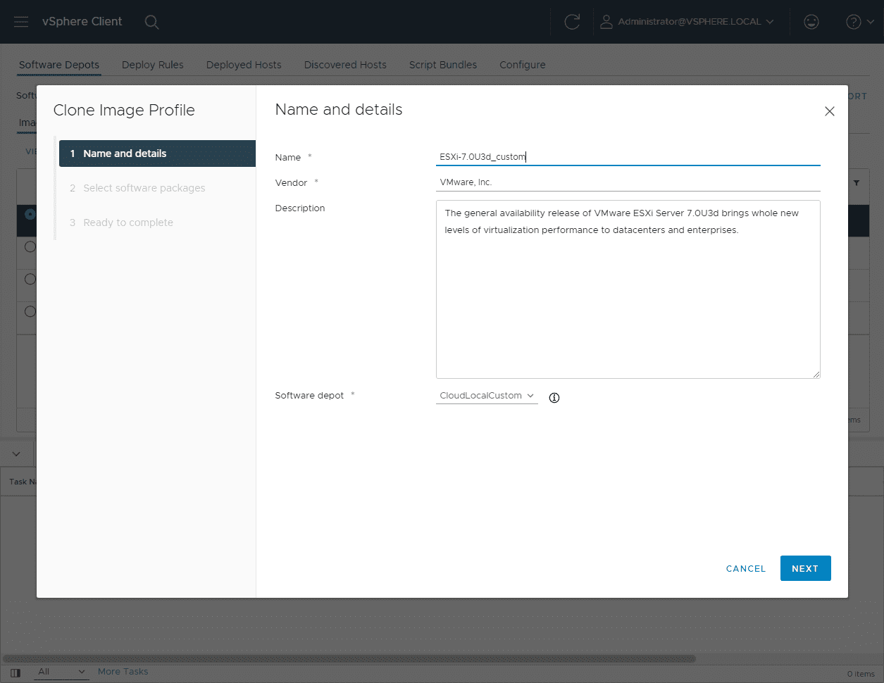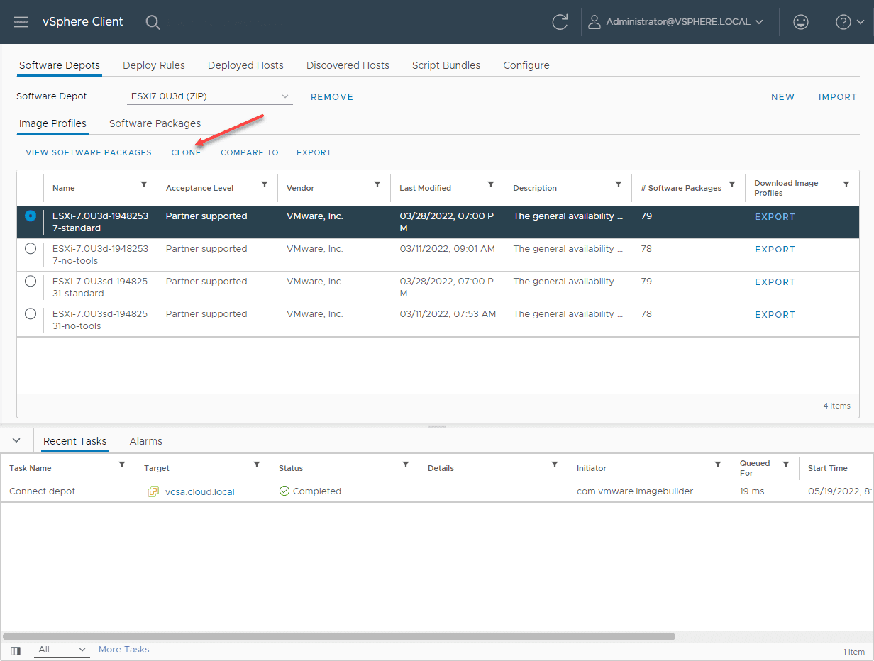 The next step is to clone the base image Software Depot that you uploaded. Again, I used the latest patch bundle for ESXi 7.0 Update 3d. By cloning, you can customize the files included which is what we want to do.