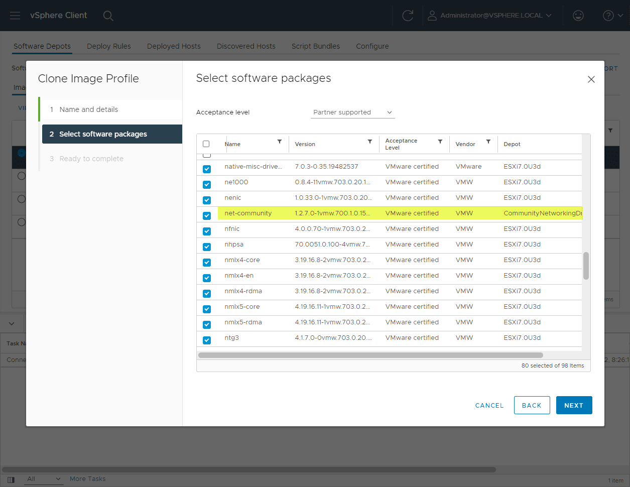 The next screen is where the magic happens. We can choose from the other software depot files we have uploaded, including the Community Networking Driver for ESXi.