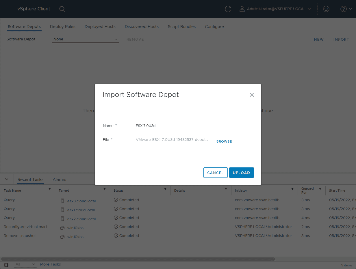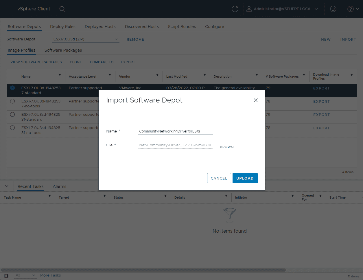 The Import Software Depot dialog will pop up. Give the bundle a name and browse to the file to upload. First, I am uploading the latest patch depot file for ESXi 7.0 Update 3d.