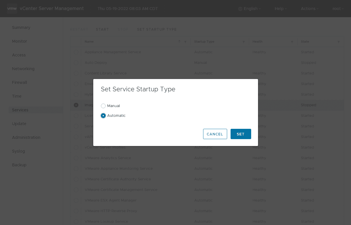 Starting and setting the required services in vCenter to Automatic