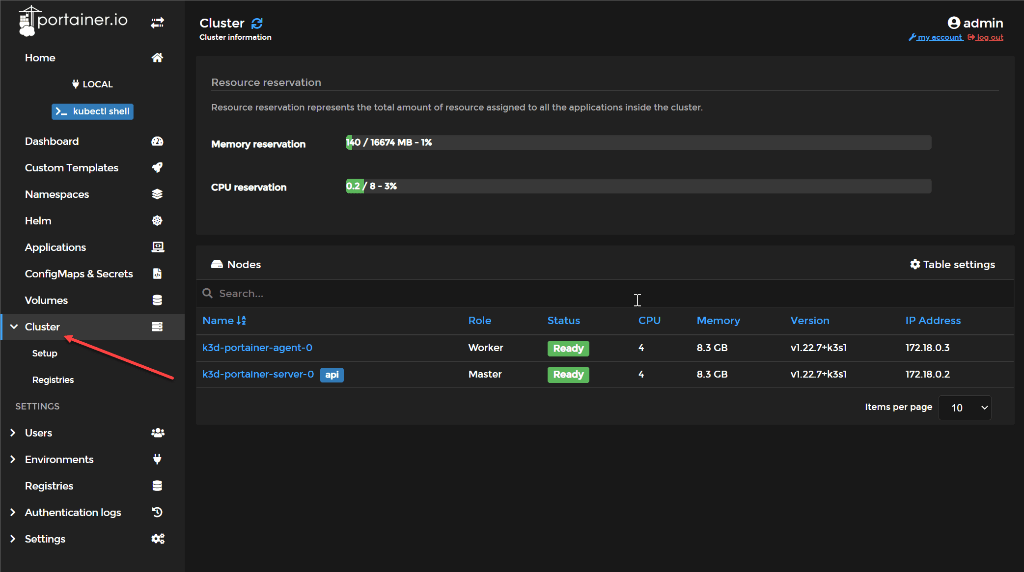 Below, if you click the Cluster menu, you will see health metrics, such as memory reservation and CPU utilization. As you can see below, the K3s dashboard with Portainer shows the nodes in your Kubernetes cluster, their role, status, memory, version, and IP address information.