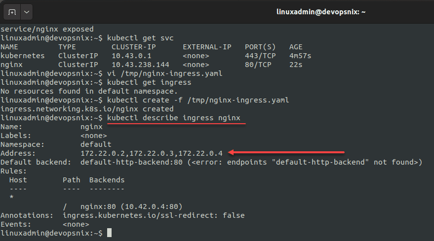 You can now navigate to your node IP, port 80, and get to the Nginx page. You should be able to do this for the IP of each Kubernetes node, showing the ingress is working correctly.