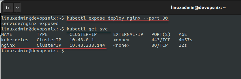 You can also view the service by running the kubectl get svc command to view the new nginx service.
