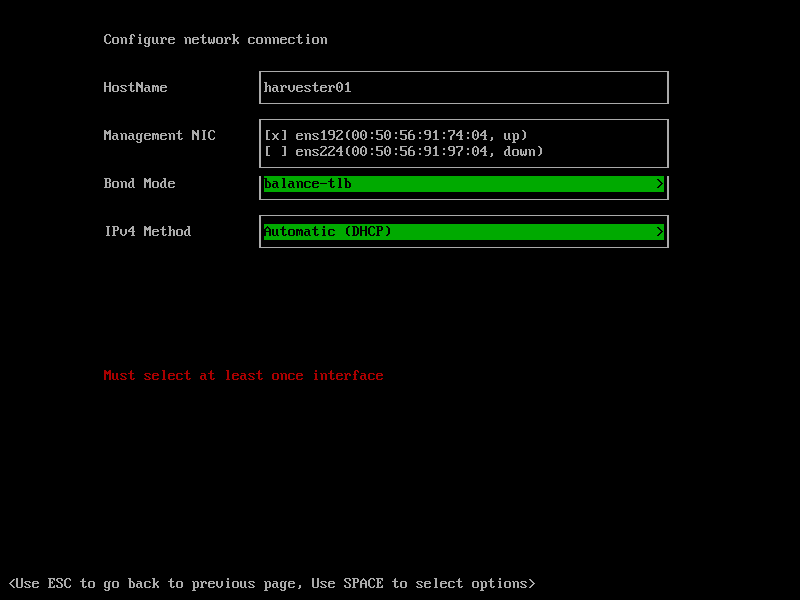 - Configure the hostname and select the network interface for the management network. By default, Harvester will create a bonded NIC named harvester-mgmt, and the IP address can either be configured via DHCP or a static method. iso-installed.png