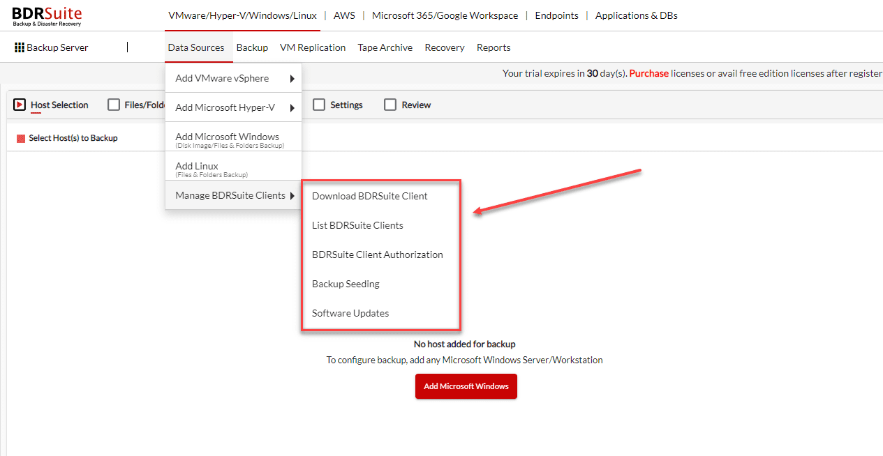 Another great new feature is configuring endpoint backups directly from the BDRSuite Backup Server Console. You can now add Windows and Linux endpoints directly from the BDRSuite console, allowing agents to be pushed automatically to the endpoints. Agents can still be installed manually, and you can also onboard new clients using bulk import using a CSV file.