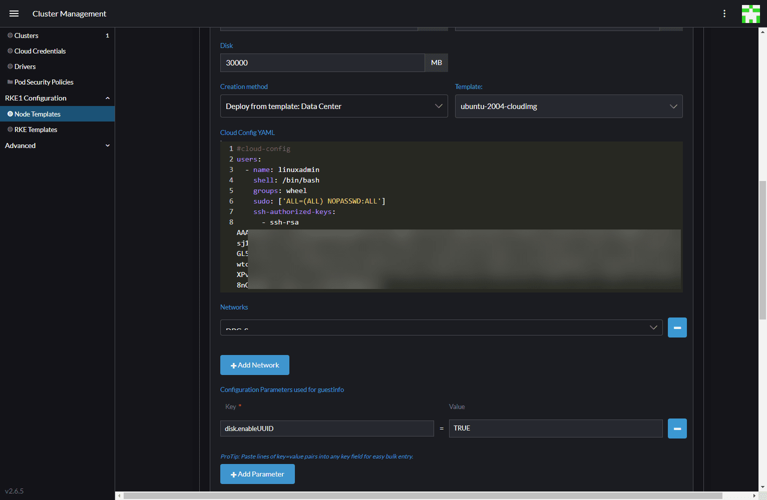 After you have configured the Cloud-config in your Rancher Node Template, you need to specify the Node Template when you deploy a new cluster. Choosing the Node Template will ensure the cluster’s Kubernetes nodes will receive the cloud-config, cloud-init YAML as specified, including the SSH keys.
