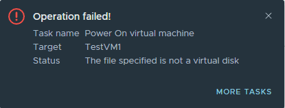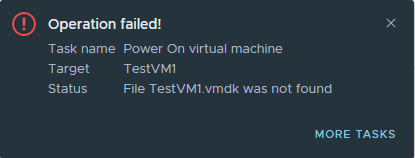 Once the good copy is deleted, if you try to power on your Virtual Machine now, you will receive the message below as the proper VMDK file is no longer found.