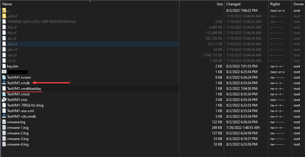 If you note below, you see the “badday” file we created which is the encrypted copy of our VMDK. However, we still see the good copy. If I am an attacker, I can now delete the good copy so that all we are left with is the encrypted copy of our VMDK.