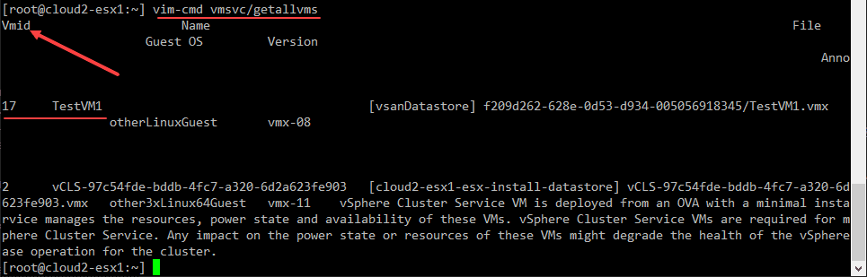 By getting the VM IDs, the attacker has the information needed to pass into vim-cmd to shutdown the virtual machine. For instance, the below will power off a VM with the VM ID 13.
