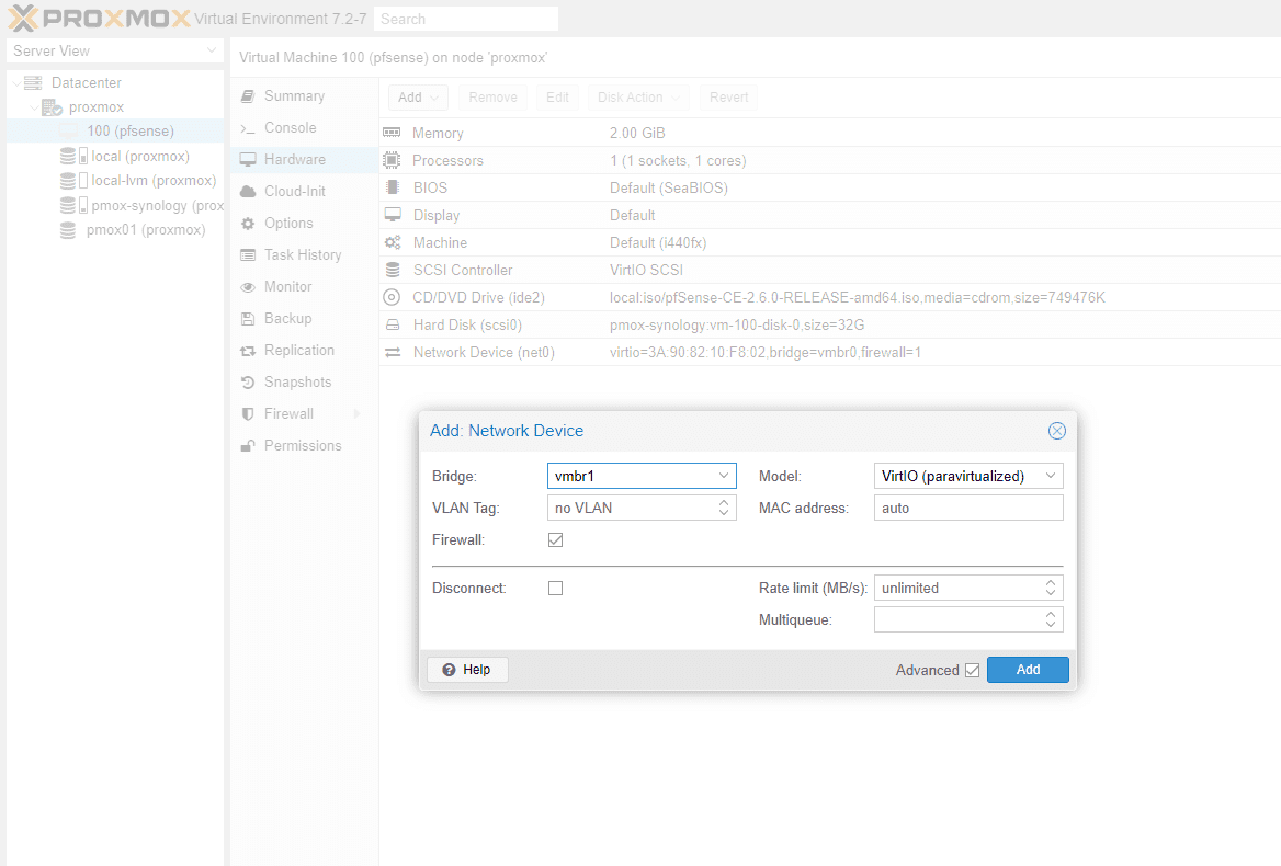 After adding an additional network device, we now have two network devices configured with the pfSense VM.