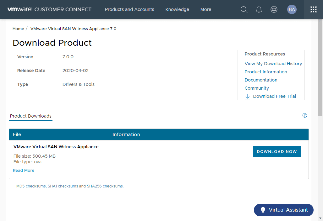 The OVA virtual appliance is a relatively small appliance you download directly from VMware. The vSAN witness virtual appliance pre-configured virtual machine must be managed by the same vCenter Server that also manages the data nodes of the vSAN stretched cluster. Below is a look at the download option from the VMware website. In the VMware portal, you will see the option to download the VMware Virtual SAN Witness appliance.