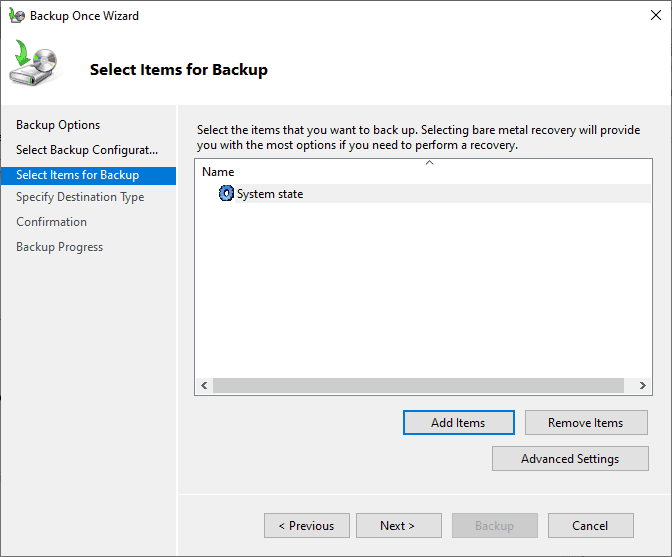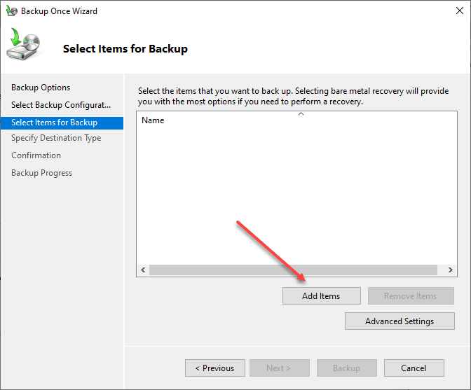 Click the add items option to add items you want to back up with Windows Server Backup.