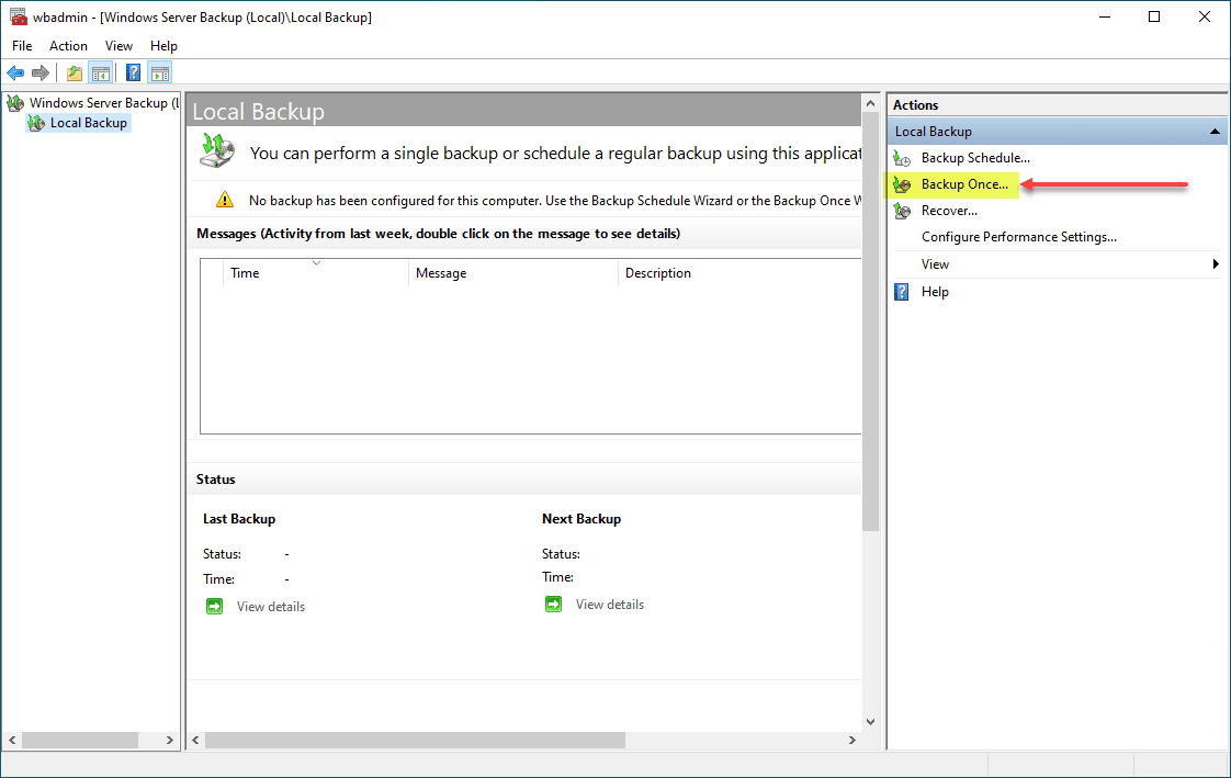 Let’s first go through the Windows Server 2022 Backup using Windows Server Backup. In the Windows Server Backup GUI, we click the Backup Oncebutton.